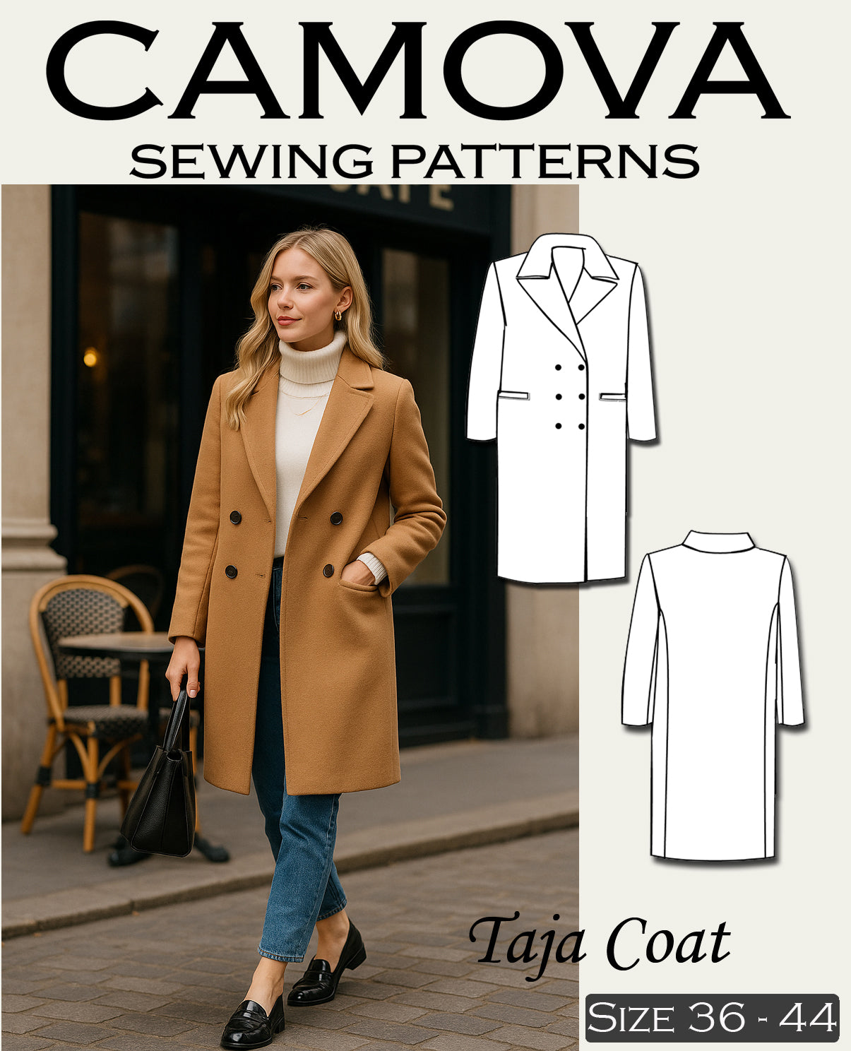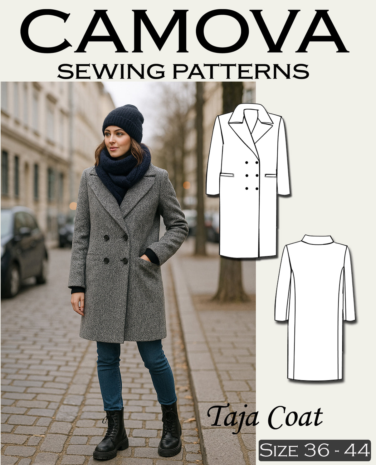 Nähe deinen eigenen eleganten Damenmantel mit dem Schnittmuster „Taja“ von CAMOVA Sewing Patterns – ein vielseitiger Klassiker für Herbst und Winter.